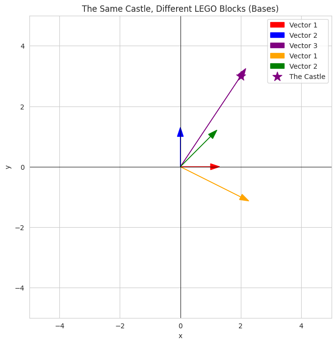 - The visualization shows the standard basis vectors, the new basis vectors, and the "castle" vector. The key is to see that the castle (purple star) is in the same location regardless of the underlying basis used to describe how to reach it. The code conceptually shows that a different combination of the friend's blocks would build the same castle.