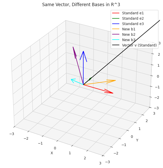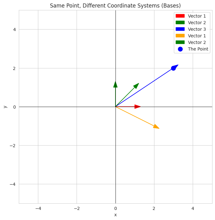- Example in \(\mathbb{R^2}\): The standard basis \(\{\begin{bmatrix} 1 \\ 0 \end{bmatrix}, \quad \begin{bmatrix} 0 \\ 1 \end{bmatrix} \}\)is convenient. But \(\{\begin{bmatrix} 1 \\ 1 \end{bmatrix}, \quad \begin{bmatrix} -1 \\ 1 \end{bmatrix} \}\) is also a valid basis. The vector \(\begin{bmatrix} 3 \\ 2 \end{bmatrix}\) can be represented in both bases with different coordinates. The underlying vector (the geometric arrow) is the same.