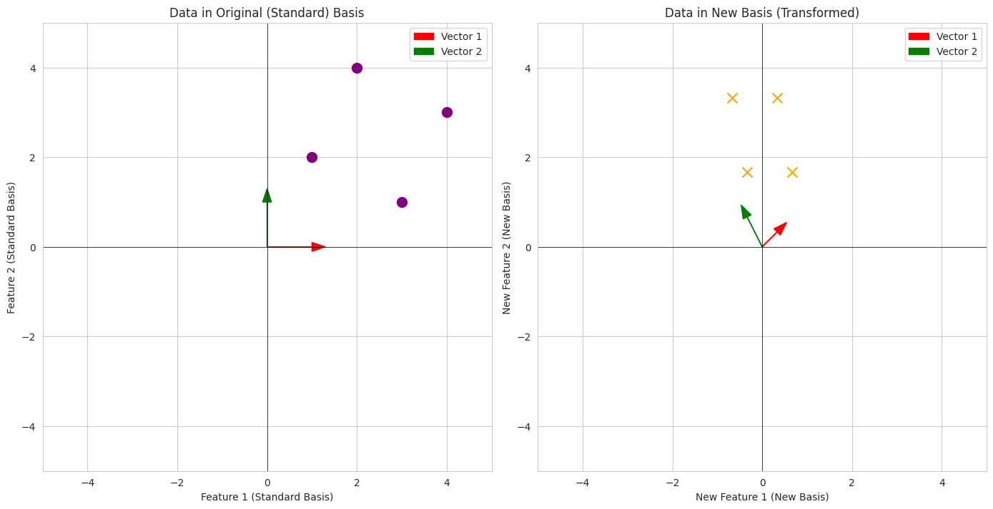 - We define an arbitrary `transformation_matrix` and use its transpose as a new basis. In a real AI/ML scenario, this matrix might be learned or computed (e.g., from PCA).