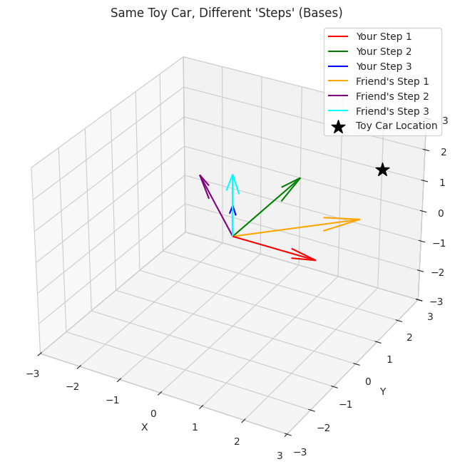 - Two different sets of basis vectors (your "steps" and your friend's "steps") are plotted. The key takeaway is that the car's location is fixed, but it can be described using different sets of reference directions.