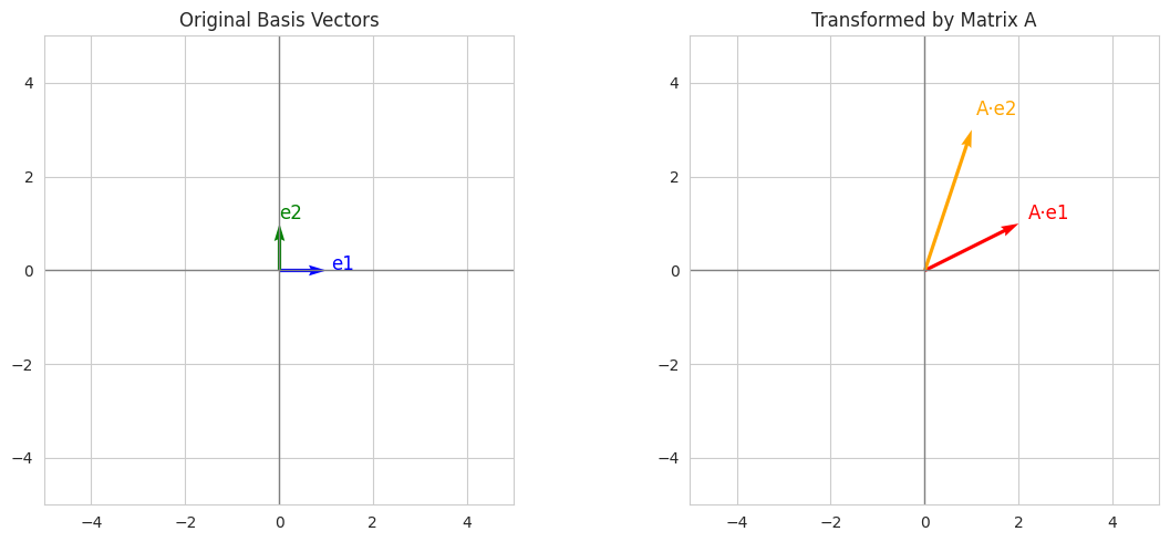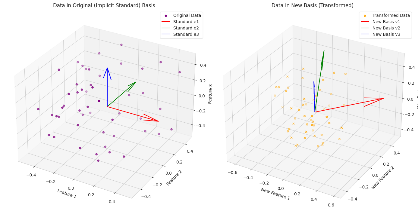 - The visualization shows the original data distribution relative to the standard axes and the transformed data distribution relative to the transformed axes. This illustrates how a change of basis can lead to a different way of looking at and representing the same data, which is crucial in feature engineering and dimensionality reduction.