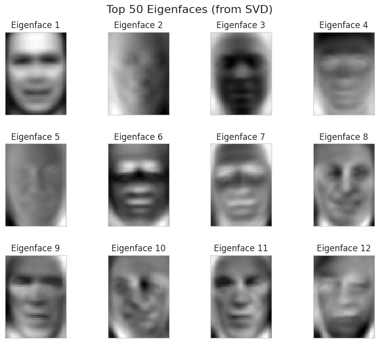 - We visualize the top `n_components` "eigenfaces" (which are related to the right-singular vectors and represent the principal components of the face data). These are the most important patterns in the faces.