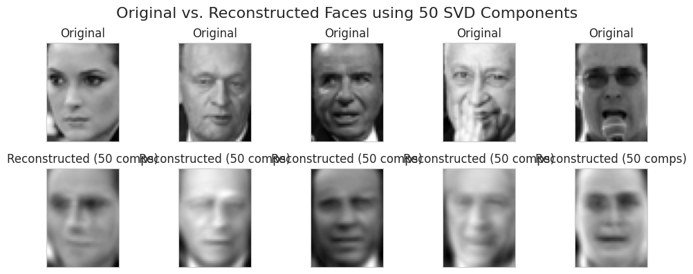 - We then show a few original faces and their reconstructions using only these `n_components`. You can see that even with a much lower dimensionality, the reconstructed faces still retain the main characteristics. This demonstrates the power of SVD for dimensionality reduction and feature extraction in AI/ML.