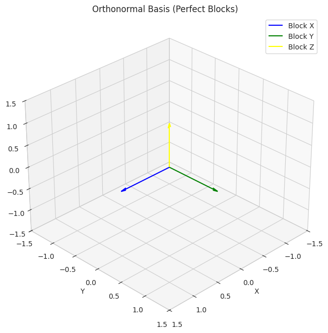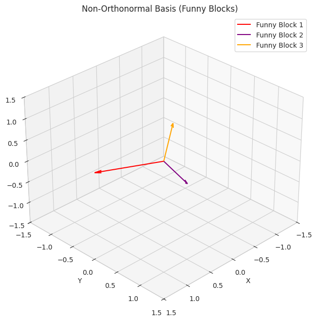 - The second set (`non_orthonormal_basis`) is skewed, representing "funny-shaped blocks." The visualization helps understand that using the perfect blocks keeps things regular and easier to understand geometrically.