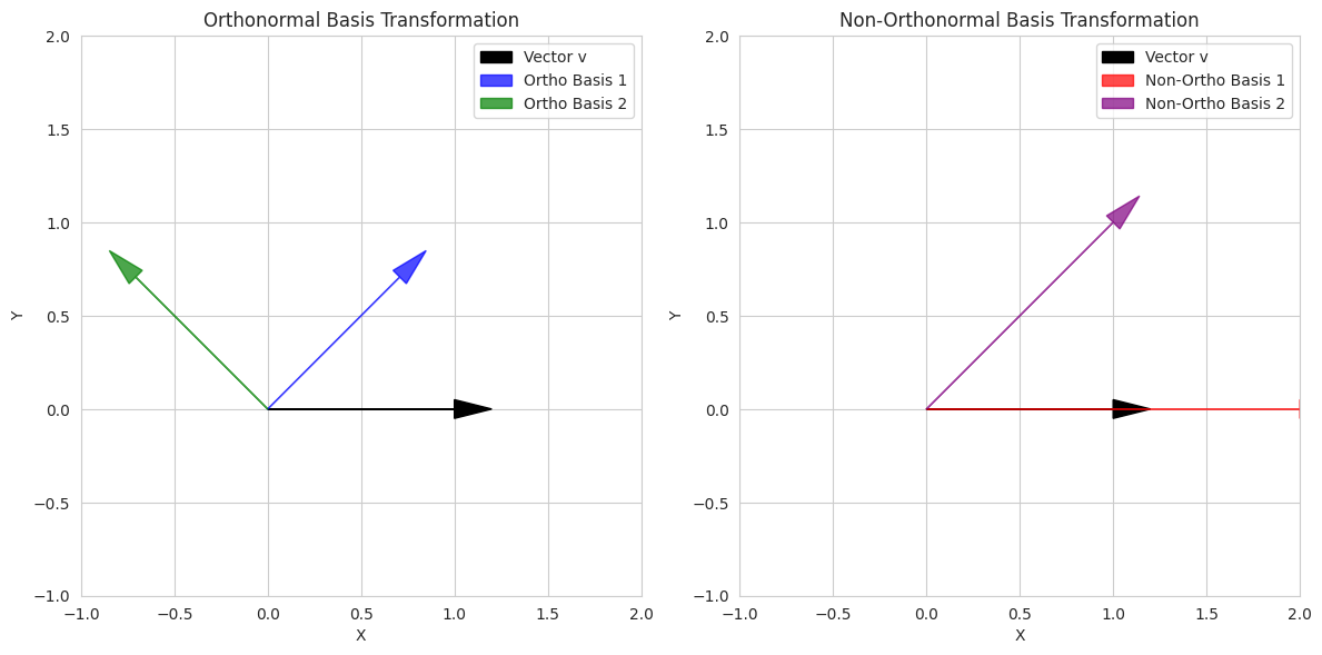 - The plots show the original vector and the basis vectors for both transformations, visually illustrating how the non-orthonormal basis can stretch or skew the space.