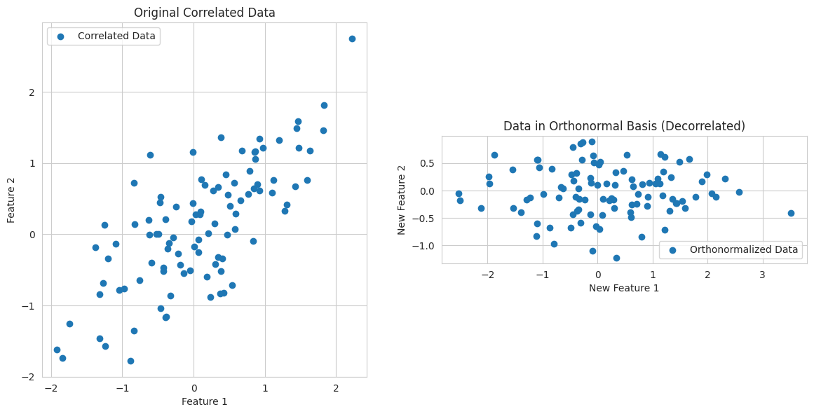 - The plots show the original correlated data and the transformed, decorrelated data in the new orthonormal basis. This highlights the importance of orthonormal bases for simplifying data structure and improving model performance in some cases.