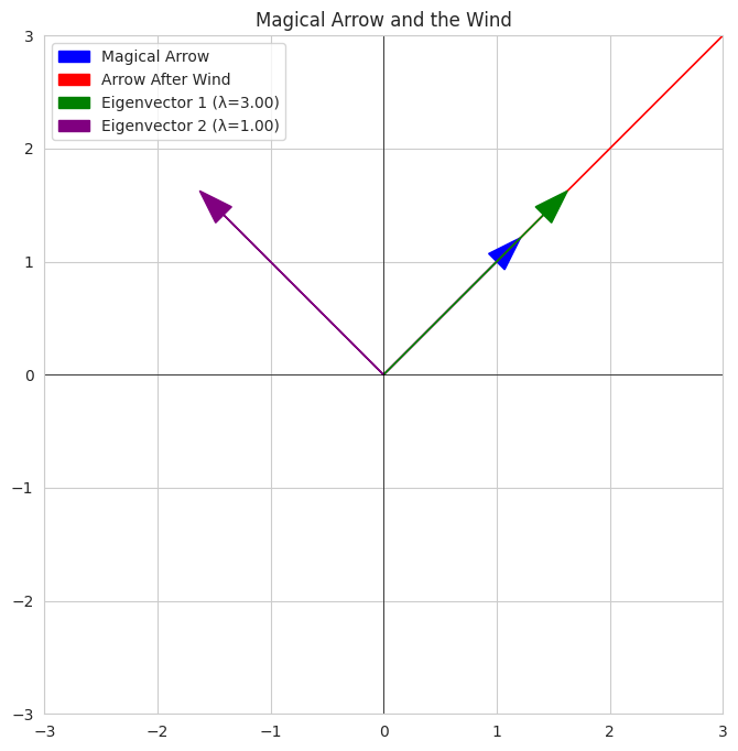 - We then plot the eigenvectors of the "wind." Notice how these eigenvectors point in directions that the transformed arrow seems to be aligned with (just stretched). The eigenvalues tell us how much stretching occurs along these special directions.