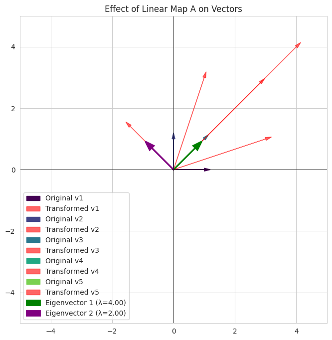 - We visualize how `A` transforms several original vectors. Observe that the eigenvectors (green and purple arrows) are only stretched or shrunk by the transformation (red arrows originating from them), staying along the same line. Other vectors change direction.