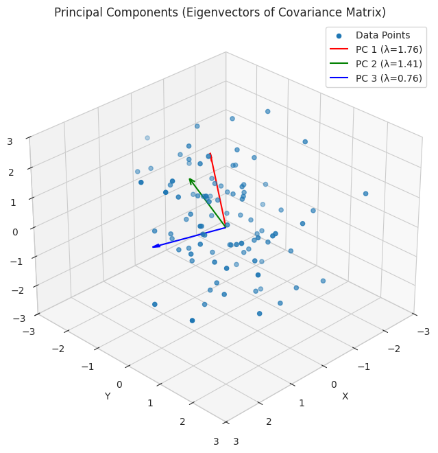 - We find the eigenvalues and eigenvectors of the covariance matrix. The eigenvectors (plotted as red, green, and blue arrows, scaled by the square root of the eigenvalues) represent the principal components – the directions of maximum variance in the data. The eigenvalues indicate the amount of variance along each principal component, showing the importance of each feature direction.
