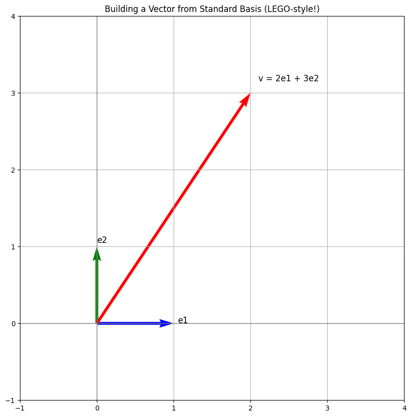 For example, in 2D space, the vectors \(\mathbf{e}_1 = \begin{bmatrix} 1 \\ 0 \end{bmatrix}, \quad \mathbf{e}_2 = \begin{bmatrix} 0 \\ 1 \end{bmatrix}\)form the standard basis. Any 2D vector like \(\begin{bmatrix} 2 \\ 3 \end{bmatrix}\) can be made by:\(2 \cdot \mathbf{e}_1 + 3 \cdot \mathbf{e}_2\)You can choose other basis vectors too, as long as they follow the two rules.