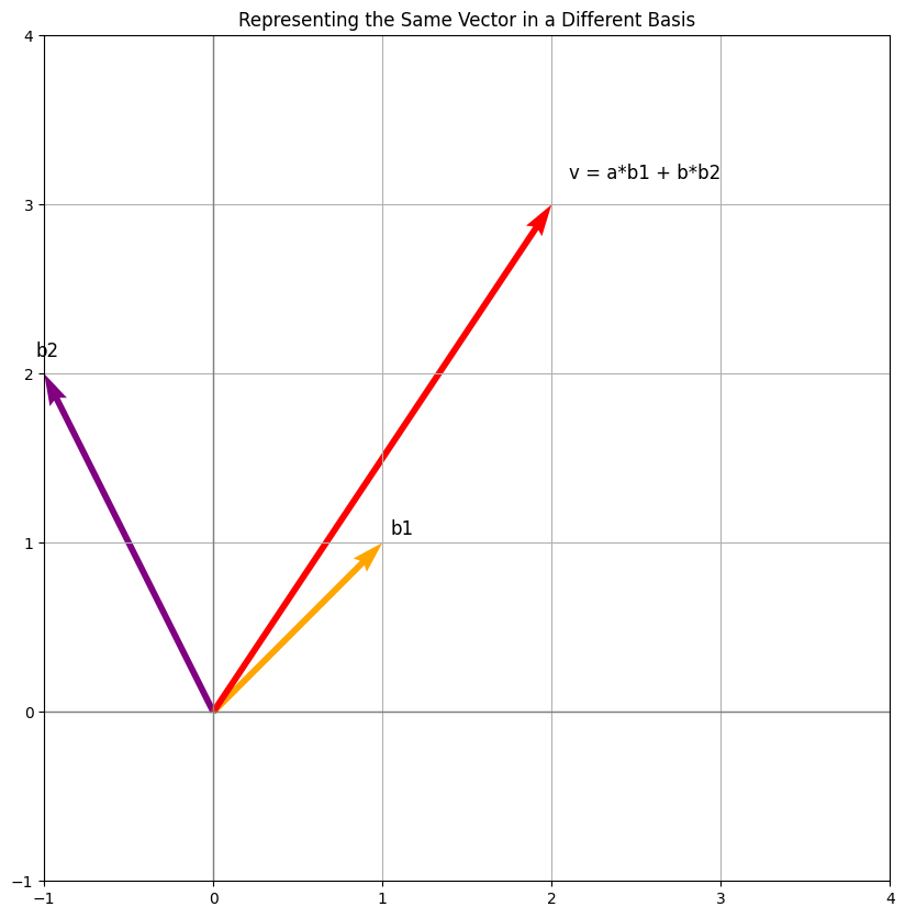 - A vector `v` is plotted. You can see that this same vector can be described using coordinates relative to the standard basis or relative to the new basis. The geometric arrow itself doesn't change.