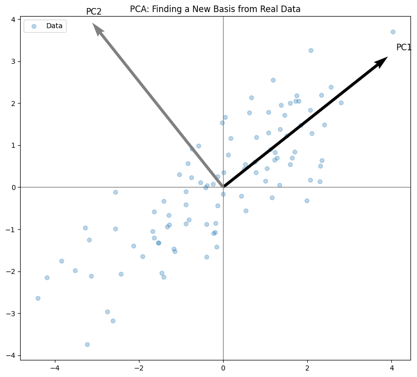 Think of PCA (Principal Component Analysis): it finds a new basis aligned with the directions of maximum variance. The principal components become the new basis vectors, and data gets projected onto them to reduce dimensions or denoise.