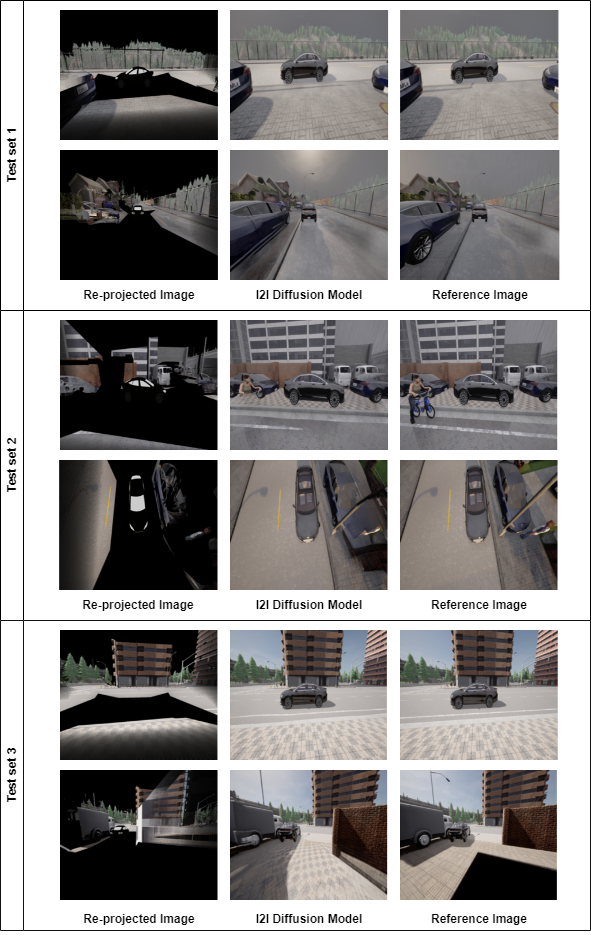 - The diffusion model is trained on paired data: re-projected images with artifacts (input) and ground-truth camera images (target)