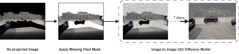 Stage 2: Diffusion-Based Image Refinement Rather than accepting these artifacts, the pipeline treats the re-projected image as a conditional input to a denoising diffusion model, specifically adapted from the Palette architecture for image-to-image translation. The key innovation lies in formulating artifact removal as a conditional inpainting problem: