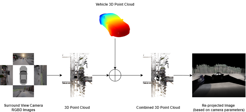 Stage 1: Point Cloud Generation and Re-projection The system begins by collecting RGBD (RGB + Depth) images from four surround-view cameras with overlapping fields of view. Using standard pinhole camera parameters, these images are fused into a unified 3D point cloud representation P ∈ ℝ^(N×6), where each of N points contains both spatial coordinates (x, y, z) and color information (r, g, b). Critically, the ego vehicle is excluded from this point cloud but maintained as prior knowledge to ensure perfect rendering from any viewpoint.
