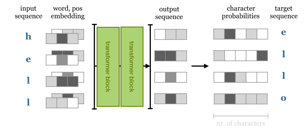 The trick used here is autoregressive model. The training regime is simple (and has been around for far longer than transformers have). A sequence is given as a input to sequence-to-sequence model which predicts the next character at each point in the sequence. In other words, the target output is the same sequence shifted one character to the left. Typically, the same thing can be achieved using RNN but they cannot look forward into the input sequence: output i depends only on inputs 0 to i. With a transformer, the output depends on the entire input sequence, so prediction of the next character becomes vacuously easy, just retrieve it from the input. To use self-attention as an autoregressive model, we’ll need to ensure that it cannot look forward into the sequence. This is realized by applying a mask to the matrix of dot products, before the softmax is applied. This mask disables all elements above the diagonal of the matrix.